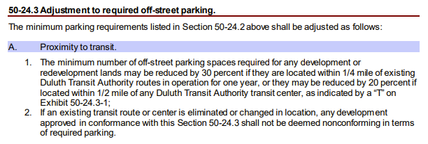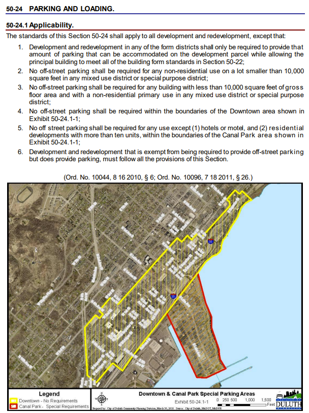 On December 11, 2023, Duluth removed parking requirements citywide while parking maximums remained in place. Previously no parking was required in downtown Duluth, while most uses were exempt within the Canal Park area. Parking minimums were reduced for uses near transit.