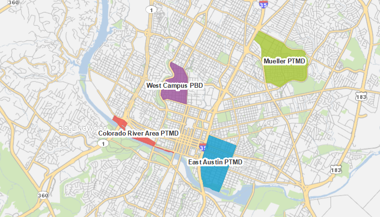 The city also passed an ordinance creating the Parking and Transportation Management District Program (PTMD) in 2014. Austin’s PTMDs function similarly to its PBD, but are more widely applicable. PMTDs broaden revenue spending requirements to include recreational spaces and allow business owners, in addition to residential groups, to request their implementation. The East Austin PTMD manages night time parking with meter enforcement beginning at 6:00 PM and has funded 150 feet of sidewalk to fill gaps. The Colorado River Area PTMD and the Mueller PTMD charge for parking around the Colorado River Trail and Mueller Lake Park, respectively, funding the upkeep of the popular recreational spaces.