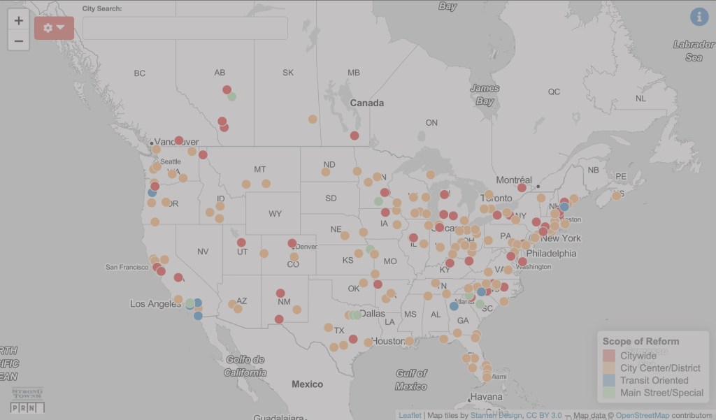 In 2015, Strong Towns led a landmark campaign in the fight to end costly parking mandates by developing a crowdsourced map of cities that have eliminated minimum parking requirements. Circulating far and wide, this map has been an emblem in illustrating where cities have made progress to prioritize people over cars, and inspires other communities