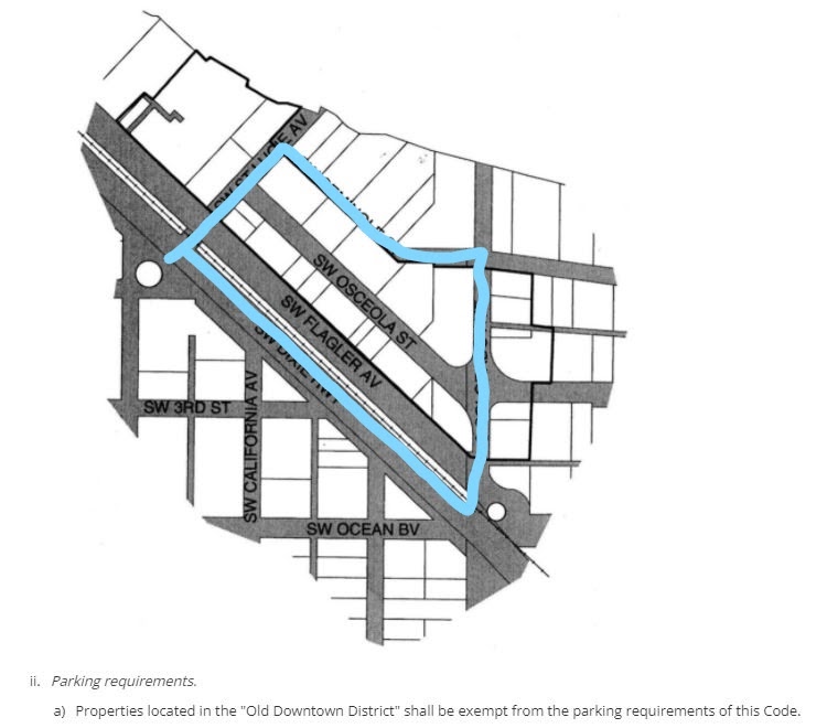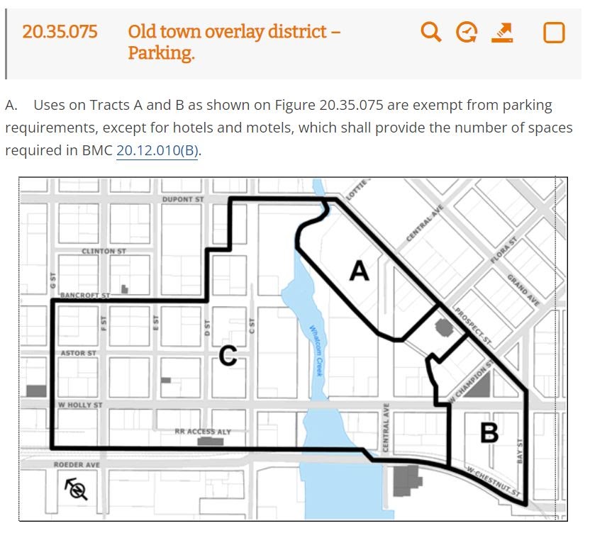 - A very large number of cities have eliminated minimum requirements for a very small portion of their communities. Of the 200 examined codes, approximately 20% have abolished or reduced parking mandates citywide. The remainder have eliminated parking requirements in specific areas such as a central business district, main street, or historic district. In fact, several codes limited parking reforms to two to four blocks within a downtown or commercial district, as seen below. Eliminating minimum parking requirements is progress no matter which way you cut it, but limiting it to such an insignificant area also limits the positive impacts of these policies. Cities with such boundaries should consider expanding them to mirror the pace of their population, density, and development growth.